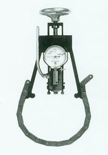 鏈?zhǔn)竭m配器 用于測試較大的圓形工件:支撐鏈套在圓形工件上,并由兩個(gè)高強(qiáng)度鉻鉬合金鋼臂和測試頭相連,當(dāng)支撐鏈承受與試驗(yàn)力相等拉力時(shí),測試頭仍能保持穩(wěn)定定位。含4英尺鏈條。 | 底座 標(biāo)準(zhǔn)底座的測試高度為350mm,喉深為100mm。有測試高度為500mm,喉深150mm的大行程底座可選。 |